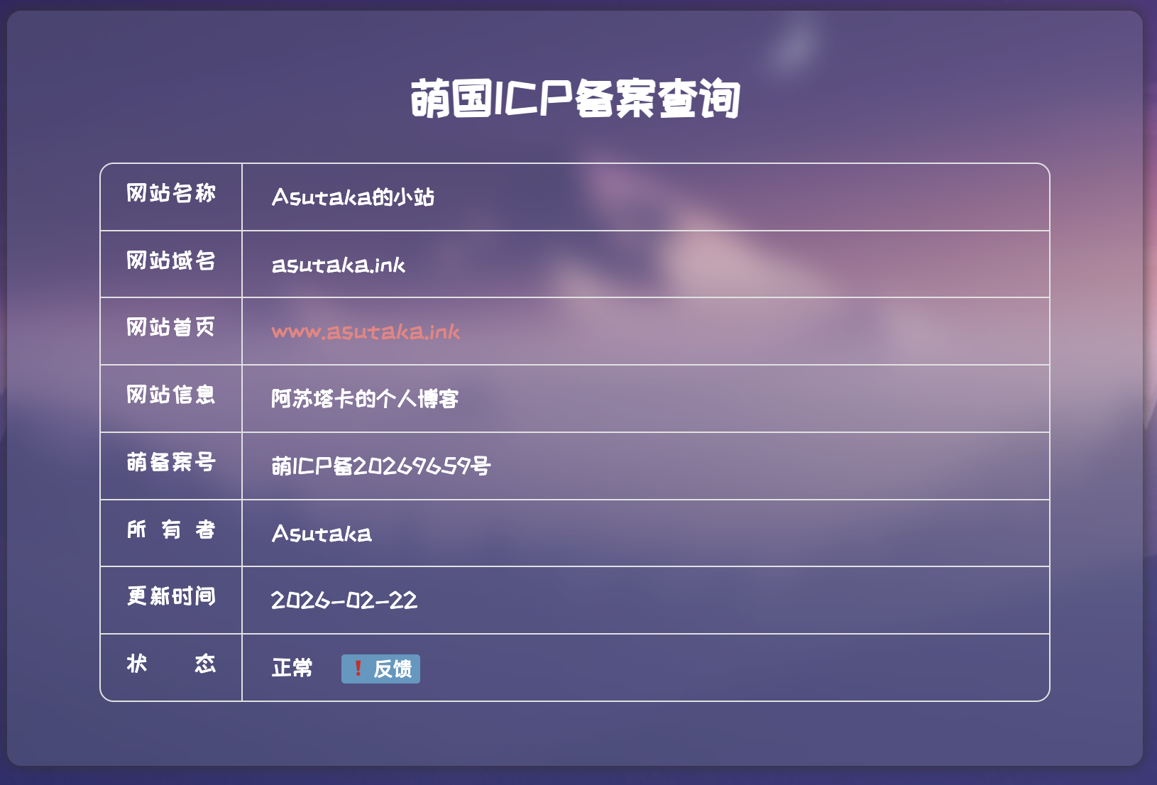 经过申请,本站已获得萌国ICP备案,正式加入萌国宇宙。现在可以通过萌国ICP备案官网查询到本站备案信息,获取到本站基本情况。